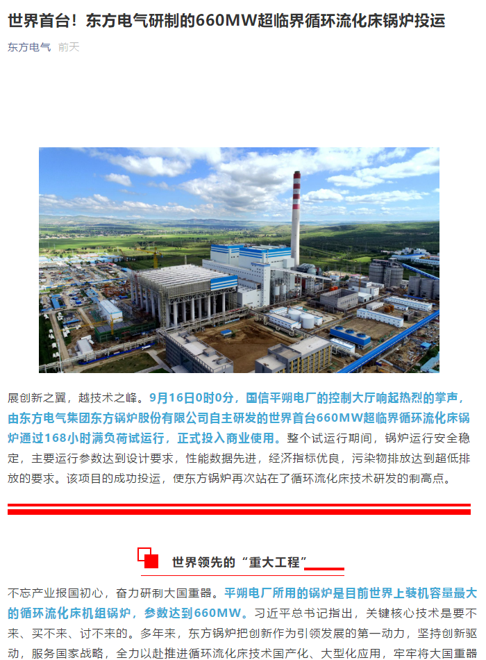 世界首台!东方电气研制的660MW超临界循环流化床锅炉投运(转)