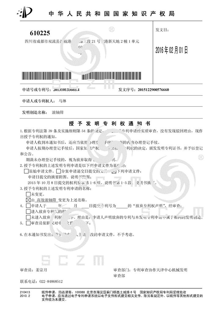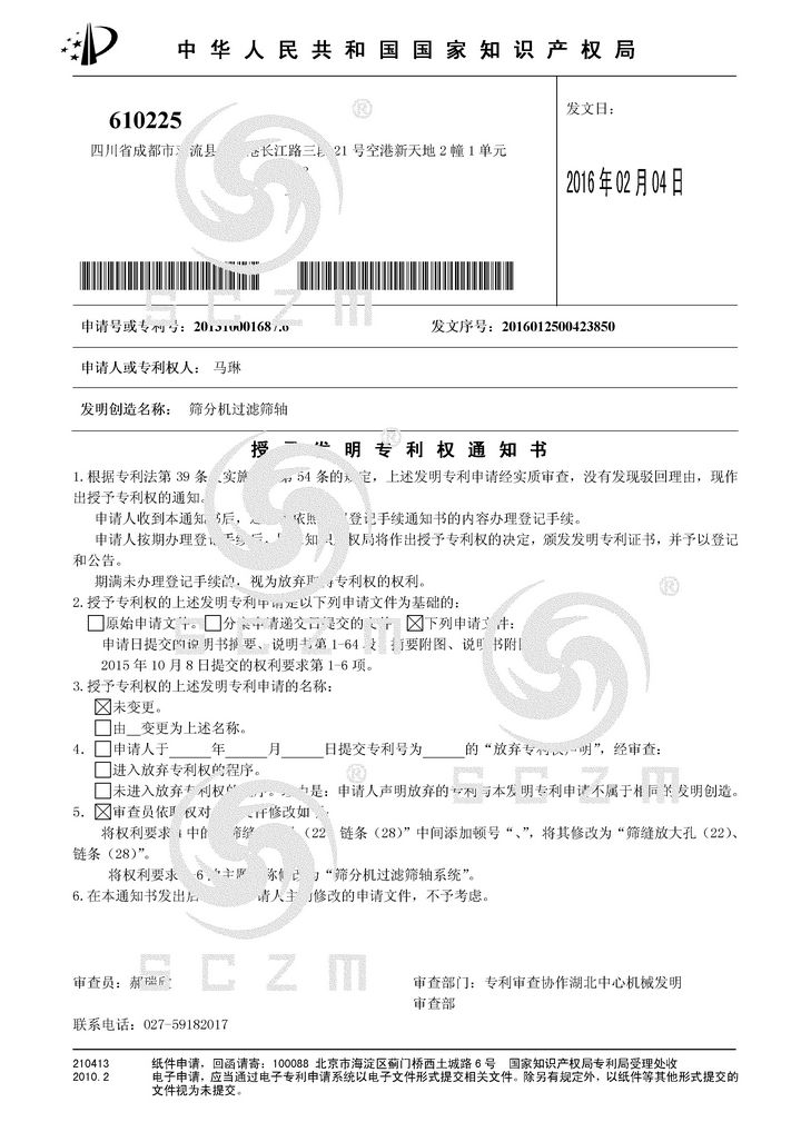 在猴年即将来临之际,四川重盟喜获两项发明专利授权,分别是滚轴筛发明专利和筛分机过滤筛轴发明专利。
